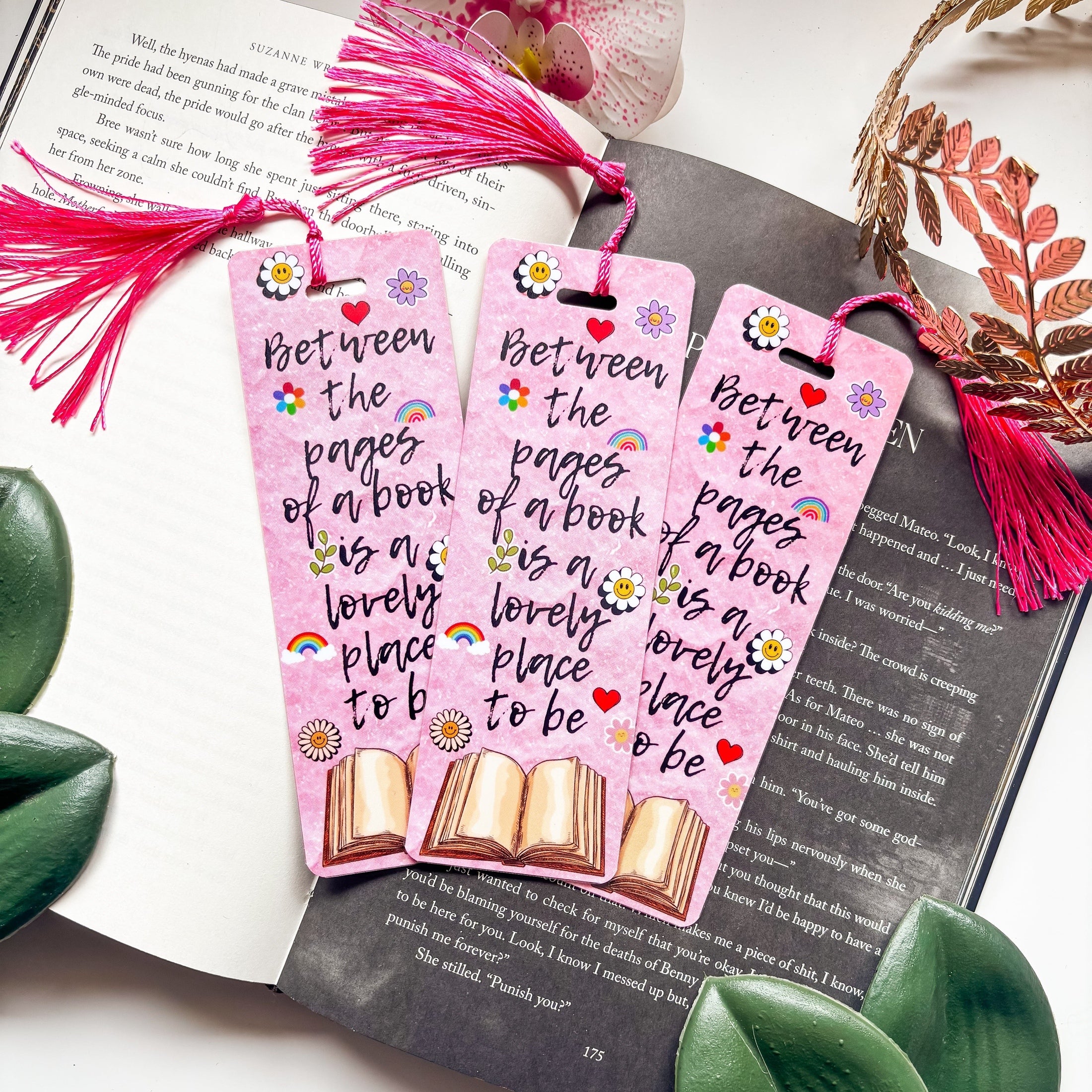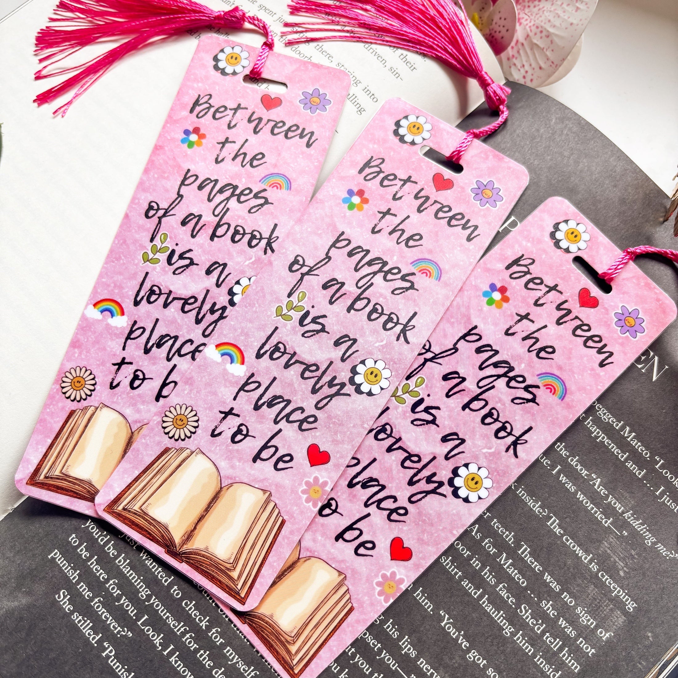 Celebrate the magic of getting lost in a good book with this beautiful girlie bookmark, featuring the heartfelt quote: "Between the pages of a book is a lovely place to be."