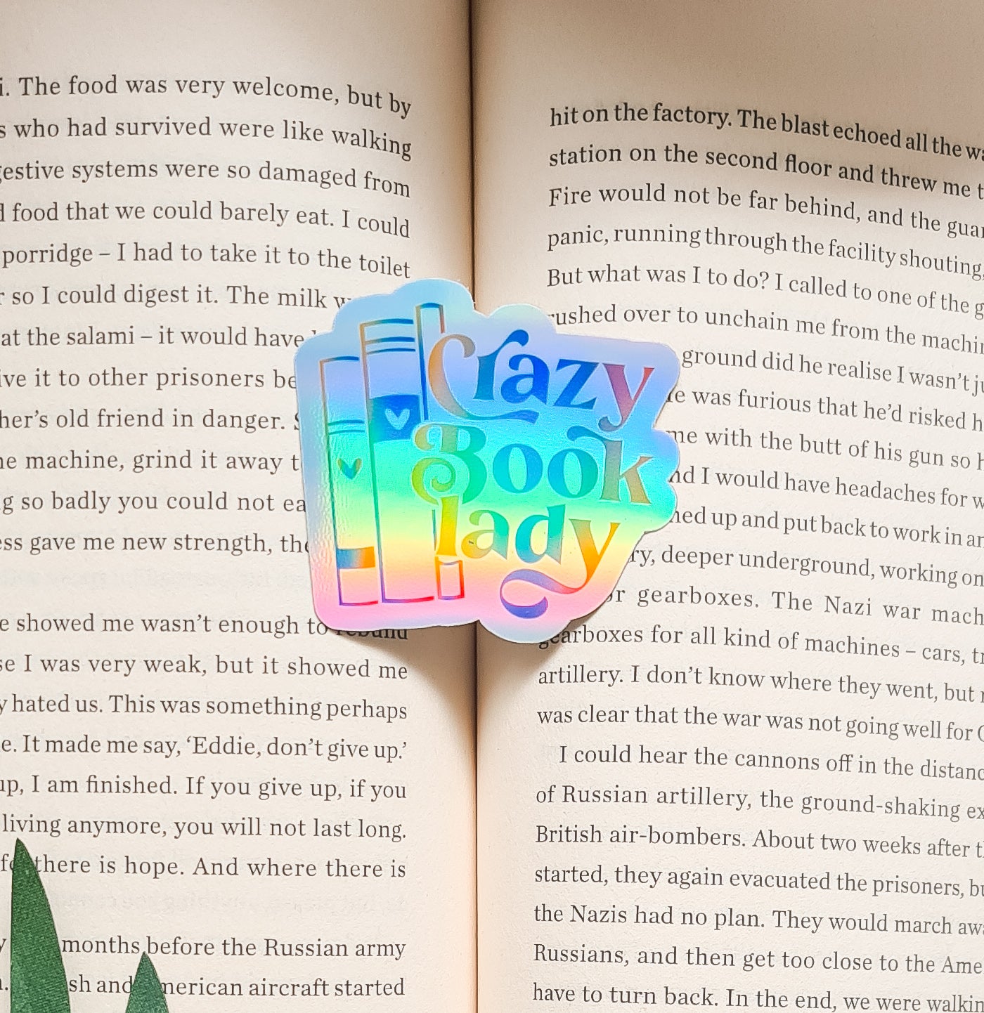Deck out your kindle or tablet with this 'Crazy Book Lady' holographic bookish sticker.