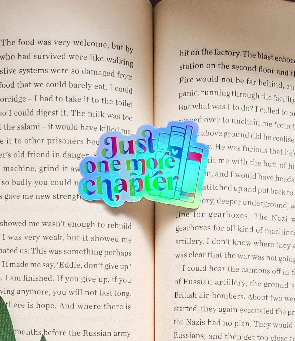 Deck out your kindle or tablet with this 'Just One More Chapter' holographic bookish sticker.