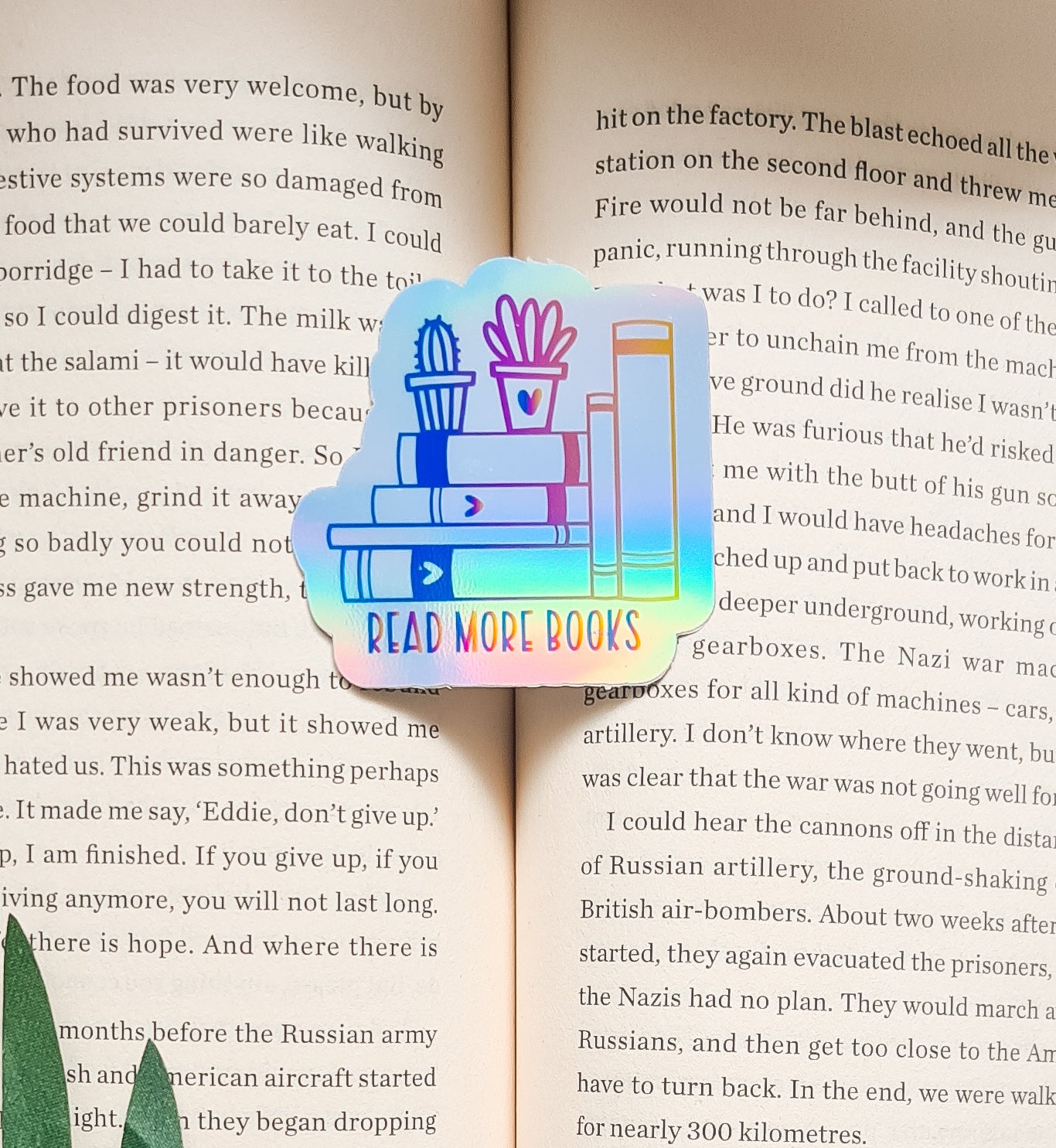 Deck out your kindle or tablet with this 'Read More Books' holographic bookish sticker.