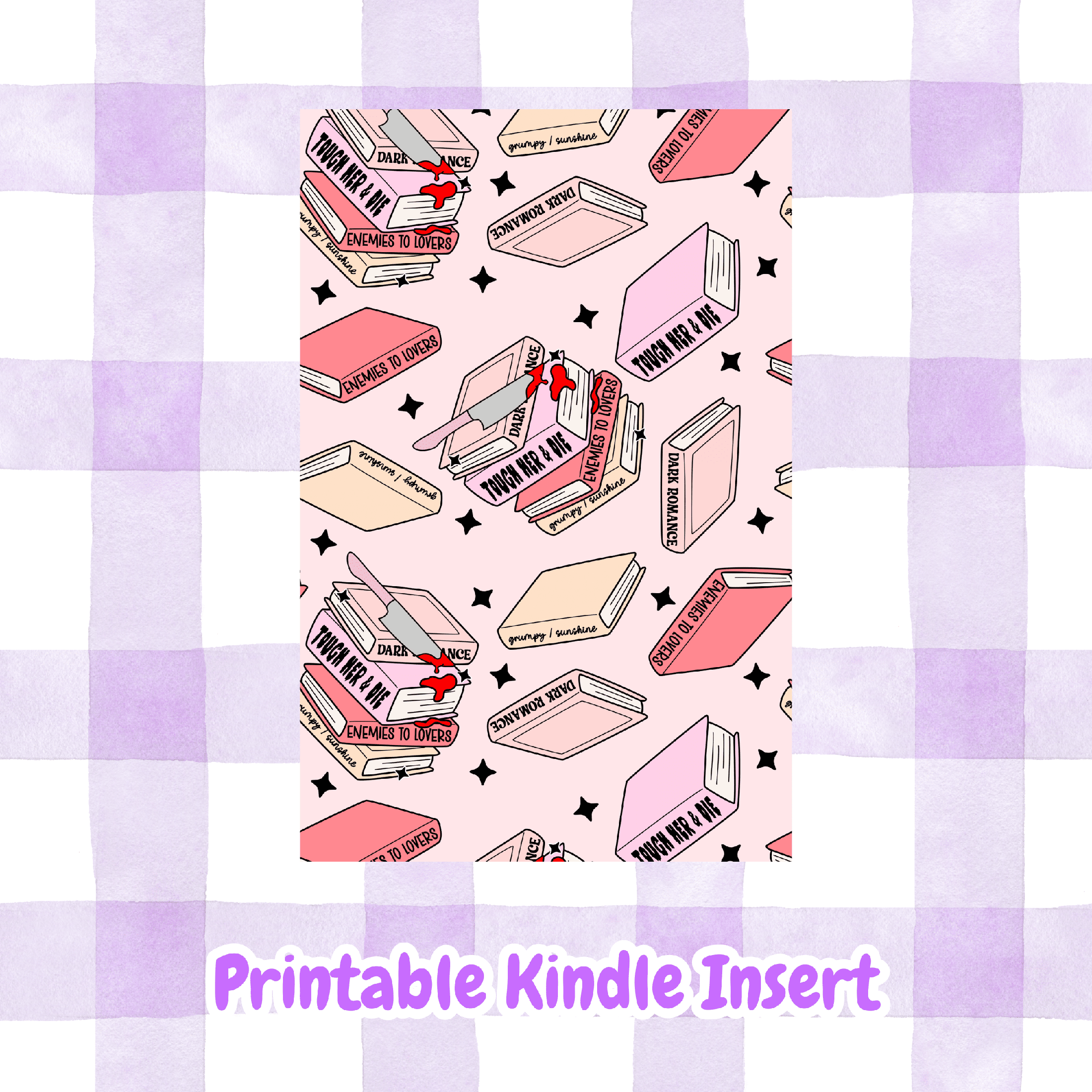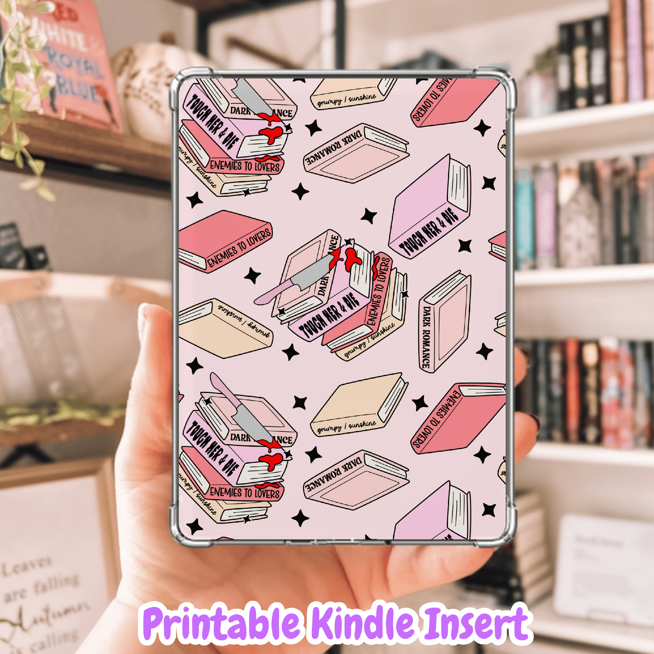 Show off your favorite romance storylines with the Tropes Kindle Insert, designed for book lovers who know that the right trope can make or break a story. This digital insert features a charming pattern of books, each spine labeled with iconic romance tropes like “Touch Her and Die,” “Grumpy x Sunshine,” and “Enemies to Lovers.”