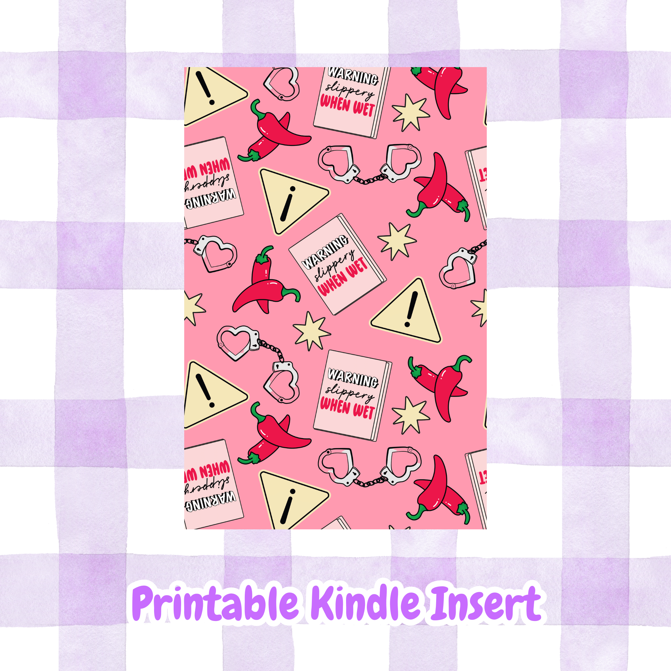 Turn up the heat on your Kindle with this bold and cheeky Spicy Smut Kindle Insert. Featuring a spicy pattern of chilli peppers, handcuffs, and a playful book labeled “Slippery When Wet,” this insert is perfect for readers who enjoy their romance extra steamy and unapologetically spicy.